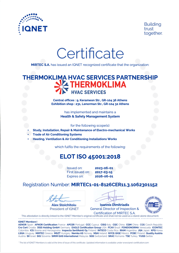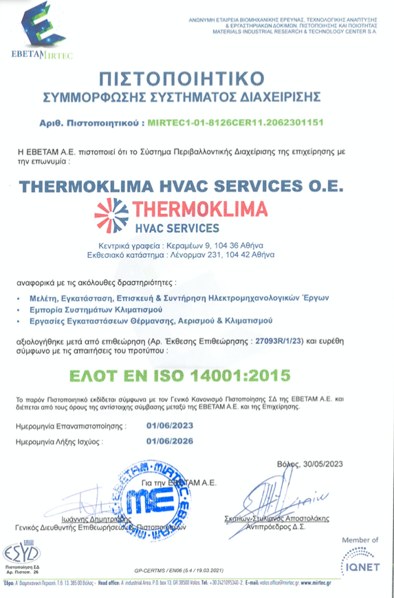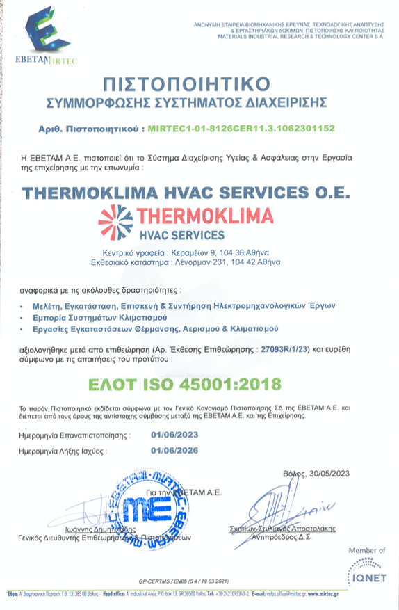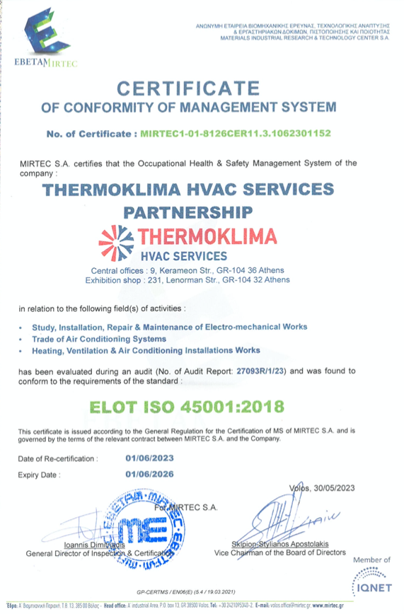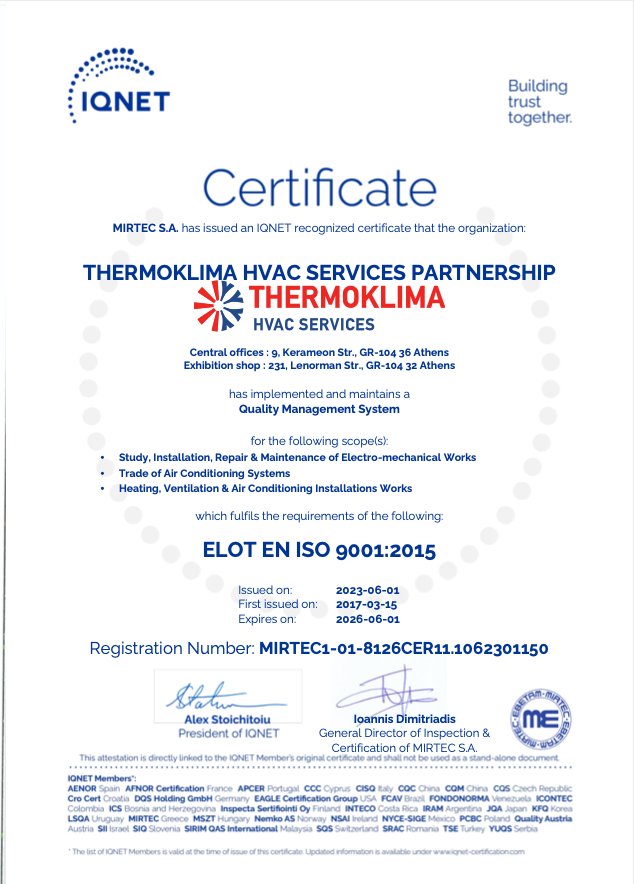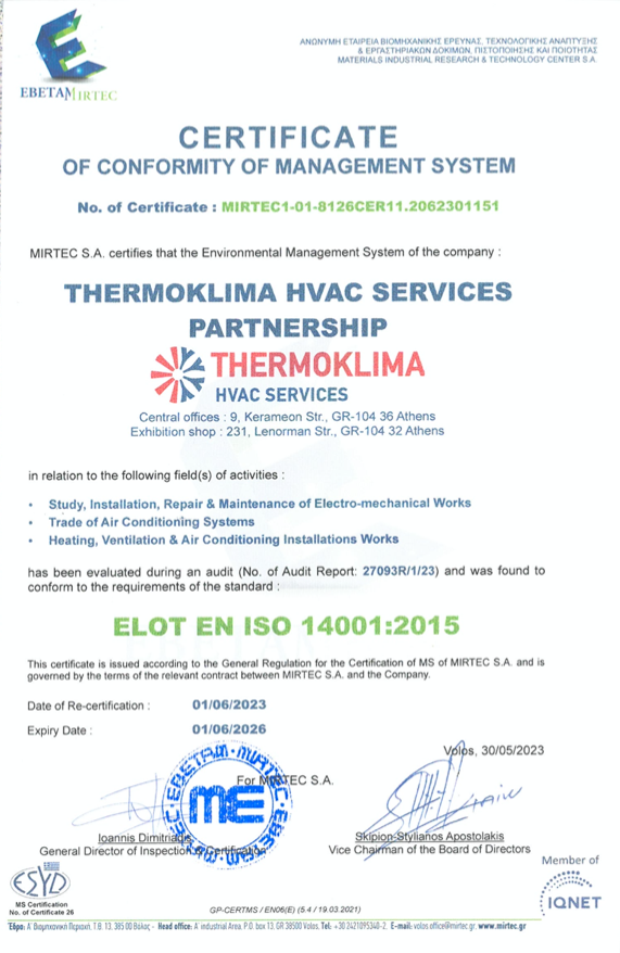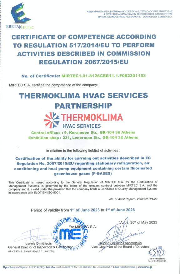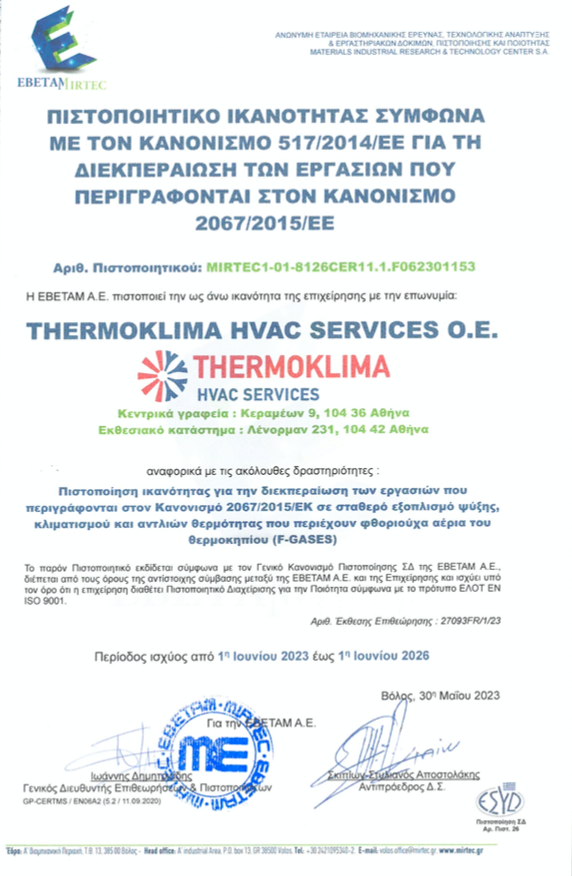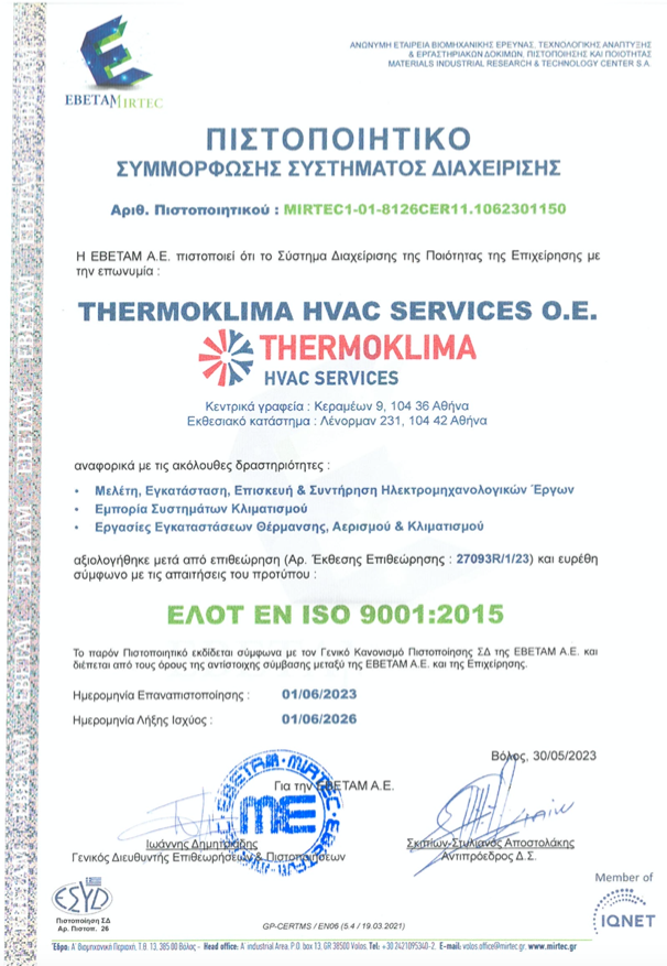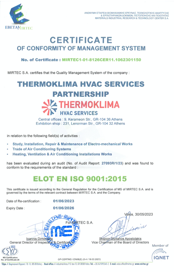 Η ΘΕΡΜΟΚΛΙΜΑ εφαρμόζει πρότυπο διασφάλισης ποιότητας ISO 9001: 2015 για την σχεδίαση , εγκατάσταση, συντήρηση, επισκευή, ηλεκτρομηχανολογικών εγκαταστάσεων - κλιματισμού, καθώς και πιστοποιητικό διαχείρησης για την διεκπεραίωση των εργασιών που περιγράφονται στον Κανονισμό 2067/2015/ΕΚ σε σταθερό εξοπλισμό, ψυξης, κλιματισμού και αντλιών θερμότητας που περιέχουν φθοριουχα αέρία του θερμοκηπίου πιστοποιημένη από την ΕΒΕΤΑΜ Α.Ε.